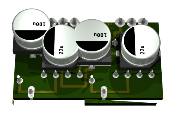 Nach dem Aufbau und dem Durchmessen mit einem Ohmmeter, habe ich die Schaltung an meine Stromversorgung gehängt. Der Test dauerte nur einem Bruchteil einer Sekunde - denn es gab einen lauten Knall in meiner Stromversorgung. Erst dachte ich, es wäre ein Problem durch den Einschaltstrom - nein es war ein schnöder Kurzschluss durch ein Kondensatorbeinchen und einem Lötzinnrest, der wohl durch mechanische Beanspruchung nach dem Durchmessen entstanden ist. Hätte ich beim Masseflächeberechnen einen größeren Isolierabstand gewählt, wäre es nicht passiert . Aber so ist dass, wenn man Ätzmittel sparen will…