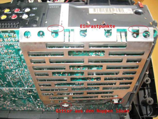 Um die Platine nachlöten zu können, muss auf der Unterseite noch ein Metallgitter entfernt werden. Man löst dieses aus den zwei Plastikhalterungen, kippt es leicht an und schiebt es nach von heraus. (Einbau problemlos in umgekehrter Reihenfolge…)