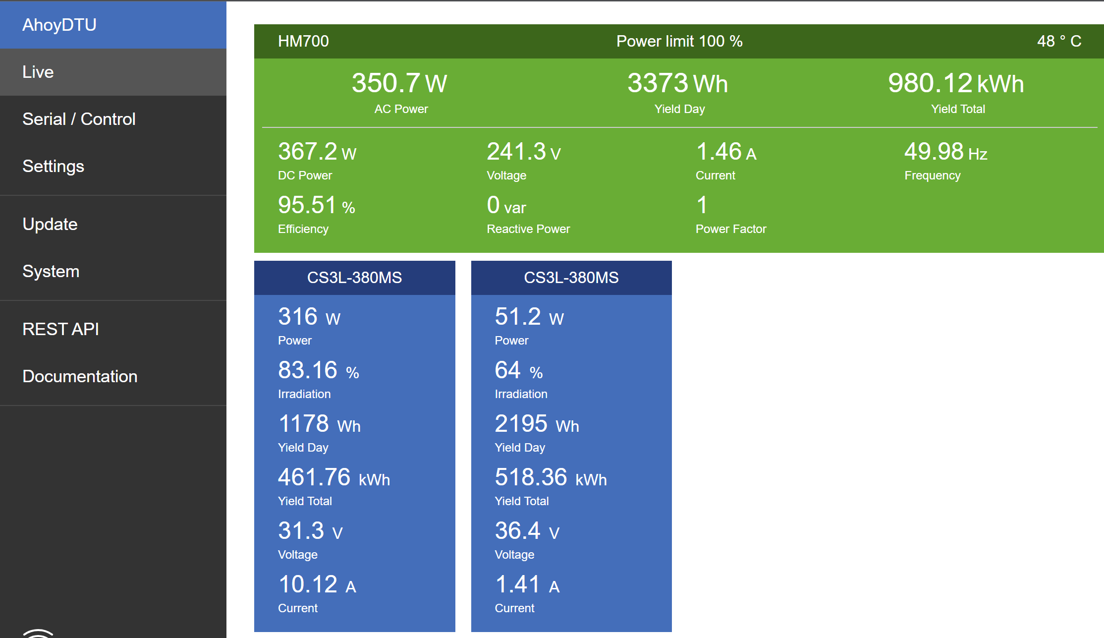 Ich habe seit Anfang 2022 eine Balkonsolaranlage. Diese habe ich selber aus Einzelkomponenten aufgebaut. Die Auswertung erfolgt mittels Homeassistant und einigen Tasmota bzw. ESPHome Devices. Der Inverter wird mit Ahoy-DTU ausgelesen.