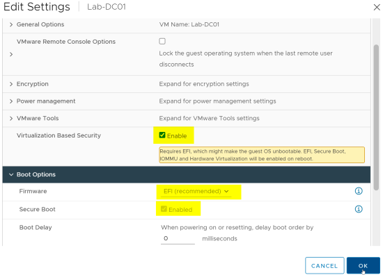 Da das Thema immer mehr nachgefragt wird, hier eine kurze Übersicht, wie man seine VMware Umgebung und VM für UEFI, Secure Boot und Virtual Based Securety (VBS) umstellt.