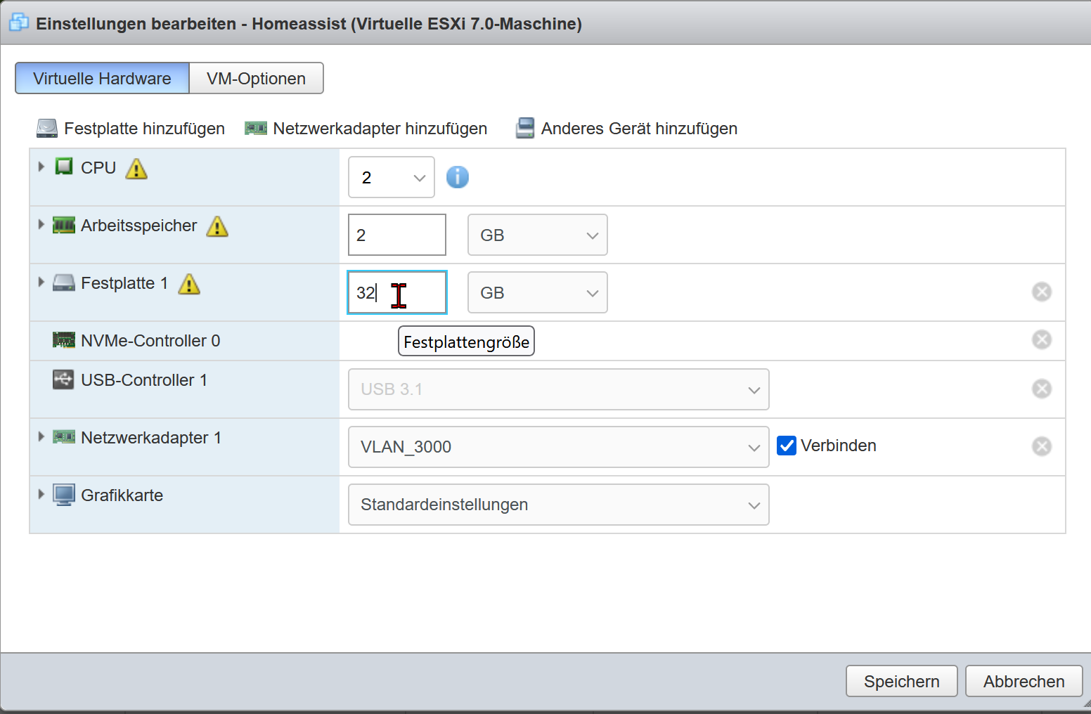Wenn die VM abgespeichert wurde, öffnen wir noch mal die Einstellung und vergrößern die Disk. Bei mir sollten 32GB reichen.